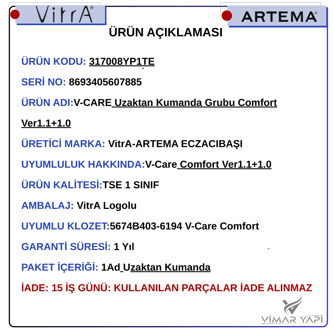 317100YP1TE V-Care Uzaktan Kumanda Grubu Ver2.0