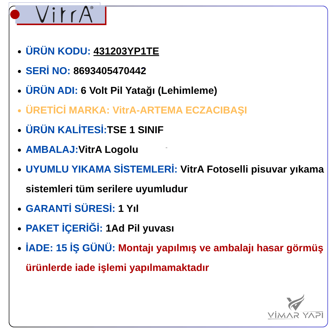 - İADE: 15 İŞ GÜNÜ: Montajı yapılmış ve ambalajı hasar görmüş ürünlerde iade işlemi yapılmamaktadır