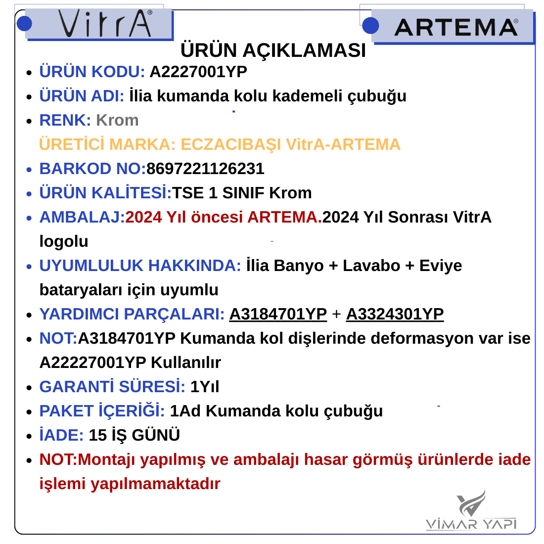 - AMBALAJ:2024 Yıl öncesi ARTEMA.2024 Yıl Sonrası VitrA logolu