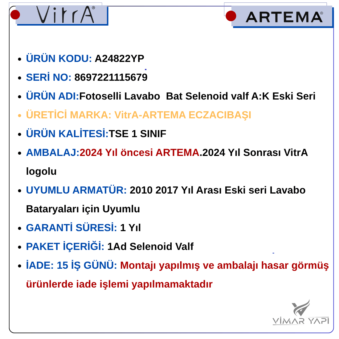 - AMBALAJ:2024 Yıl öncesi ARTEMA.2024 Yıl Sonrası VitrA logolu