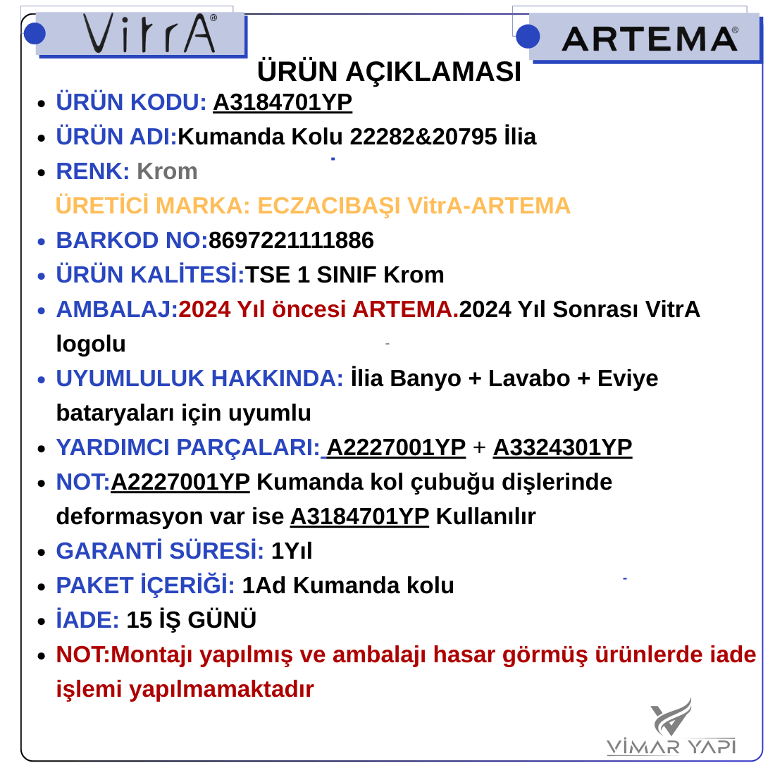 - AMBALAJ:2024 Yıl öncesi ARTEMA.2024 Yıl Sonrası VitrA logolu