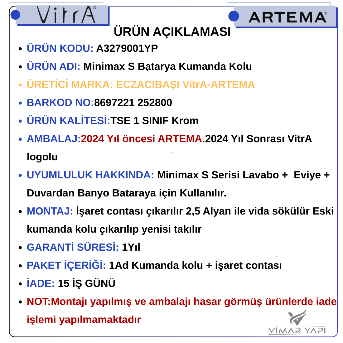 | AMBALAJ:2024 Yıl öncesi ARTEMA.2024 Yıl Sonrası VitrA logolu |