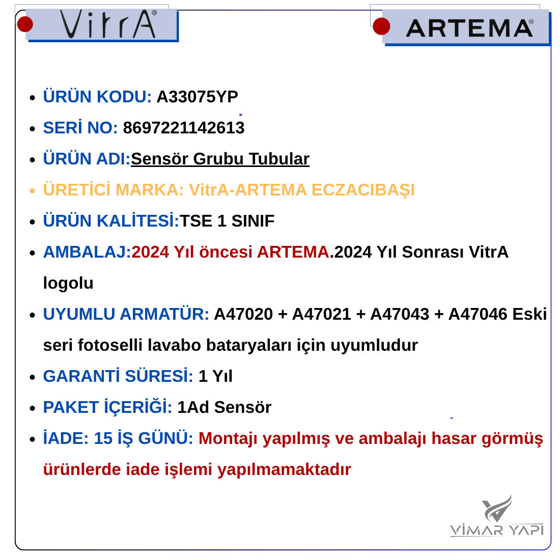 - AMBALAJ:2024 Yıl öncesi ARTEMA.2024 Yıl Sonrası VitrA logolu