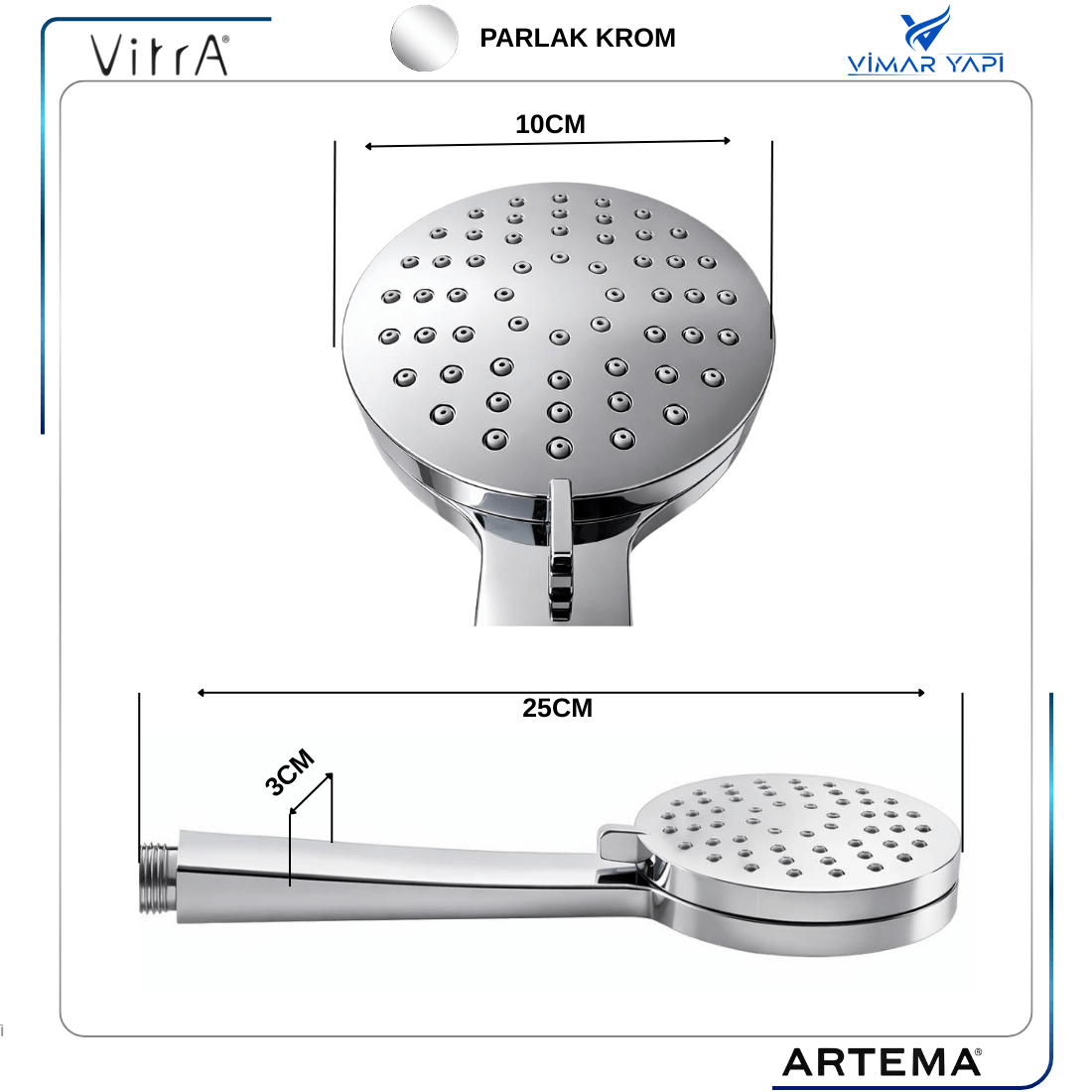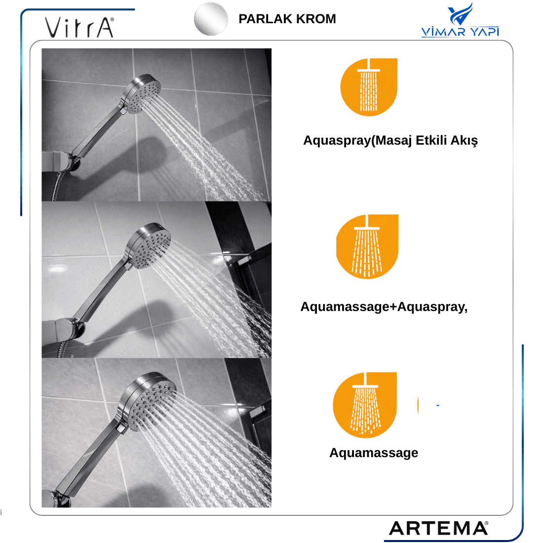 · ÜRÜN KODU: A3348001YP · ÜRÜN ADI: El Duşu 3 Fonksiyonlu Moonshower · ÜRETİCİ MARKA: VitrA-ARTEMA ECZACIBAŞI · SERİ NO:8697221207800 · ÜRÜN KALİTESİ:TSE 1 SINIF Kromaj Kaplama · AMBALAJ:2024 Yıl öncesi ARTEMA.2024 Yıl Sonrası VitrA logolu · UYUMLULUK HAKKINDA: Standart ½ Tüm duş siprallerine uyumludur Eskiyi sök yenisini tak · KULLANIM: Duş üzerindeki Butonu çevirip 3 farklı akış ile kullanılır · TEMİZLİK ÖNERİSİ:Krom yüzeyler Sulandırılmış elma,Üzüm Sirkesi ile temizlenmelidir.Su akış nozulları kireç kaynaklı tıkanacağı için parmak ucu ile ovalanarak temizlenmeli. · GARANTİ SÜRESİ: 1Yıl · PAKET İÇERİĞİ: 1Ad El duşu · İADE:15 İŞ GÜNÜ: KULLANILAN PARÇALAR İADE ALINMAZ - https://www.vitra.com.tr/servisler-ve-satis-noktalari/