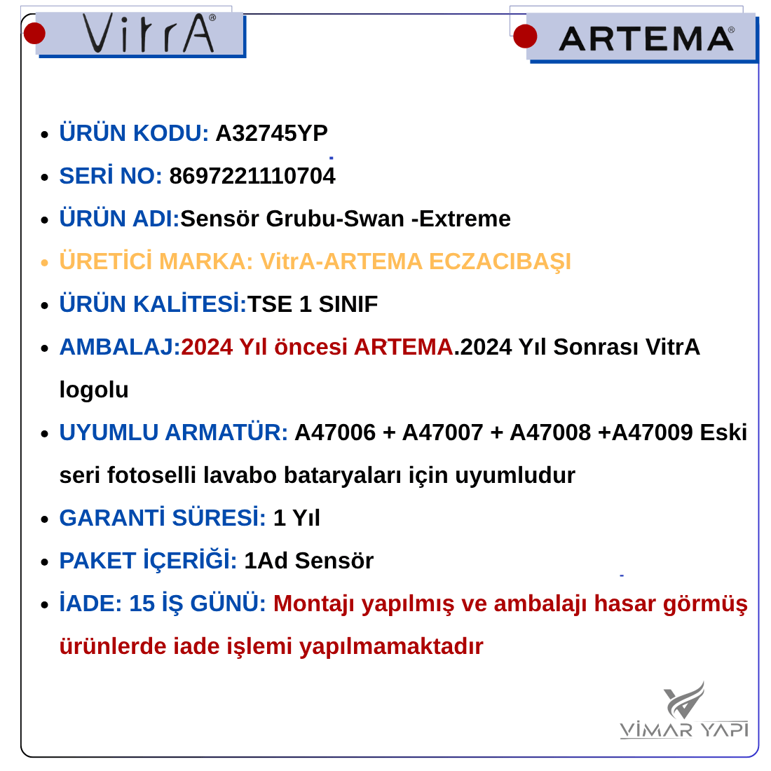 - AMBALAJ:2024 Yıl öncesi ARTEMA.2024 Yıl Sonrası VitrA logolu
