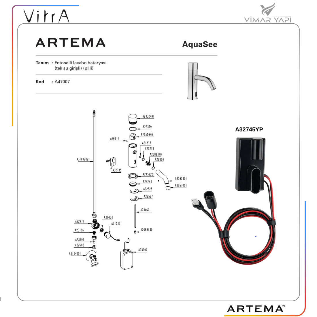 - UYUMLU ARMATÜR: A47006 + A47007 + A47008 +A47009 Eski seri fotoselli lavabo bataryaları için uyumludur
