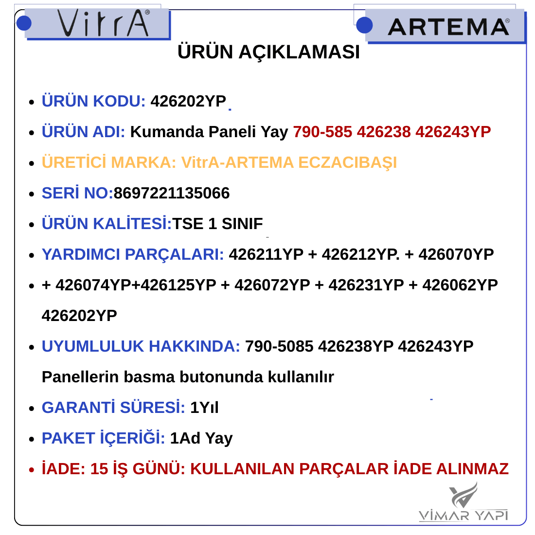- ÜRÜN ADI: Kumanda Paneli Yay 790-585 426238 426243YP